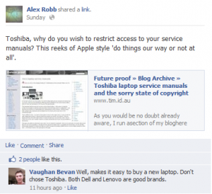 As a factual statement, I can’t really argue with this. Again though, Dell, HP and Lenovo apparently do not find this a concern. Having looked at service manuals from each company, I personally cannot see what Toshiba manuals contain that the others do not that might be something a company would reasonably wish to withhold from its customers. It is clear that this is a decision Toshiba have made in the opposite direction to these other companies, and it is not a direction that is in the best interest of its customers.